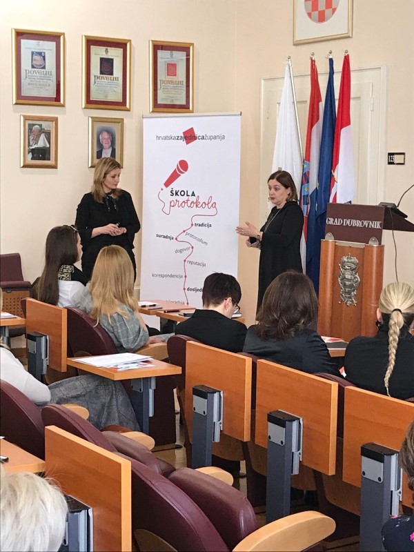 U organizaciji Hrvatske zajednice županija i Dubrovačko-neretvanske županije, u Velikoj vijećnici Grada Dubrovnika u četvrtak 8. ožujka održana je ”Škola protokola“, edukacijski program usmjeren službencima zaduženim za poslove protokola u općinama, gradovima i županijama. Jednodnevnu edukaciju vodile su Ermina Duraj, voditeljica Kabineta župana – Službe za odnose s javnošću i protokol Primorsko-goranske županije i Senka Bilać, v.d. pročelnice Ureda župana Šibensko-kninske županije.